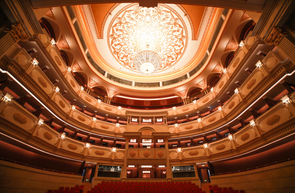 新落成的中央歌劇院劇場總建筑面積4.1萬平方米,整體設計以“鳳凰”為核心立意詮釋建筑內涵主題。劇場色調以金黃色為主,內部金黃色與紅色相交織。橢圓型觀眾廳呈螺旋放射分布,如同鳳凰騰飛時洒下的光芒。劇場中央約150平方米的超大樂池可實現120人編制的交響樂團同時演奏。