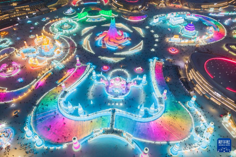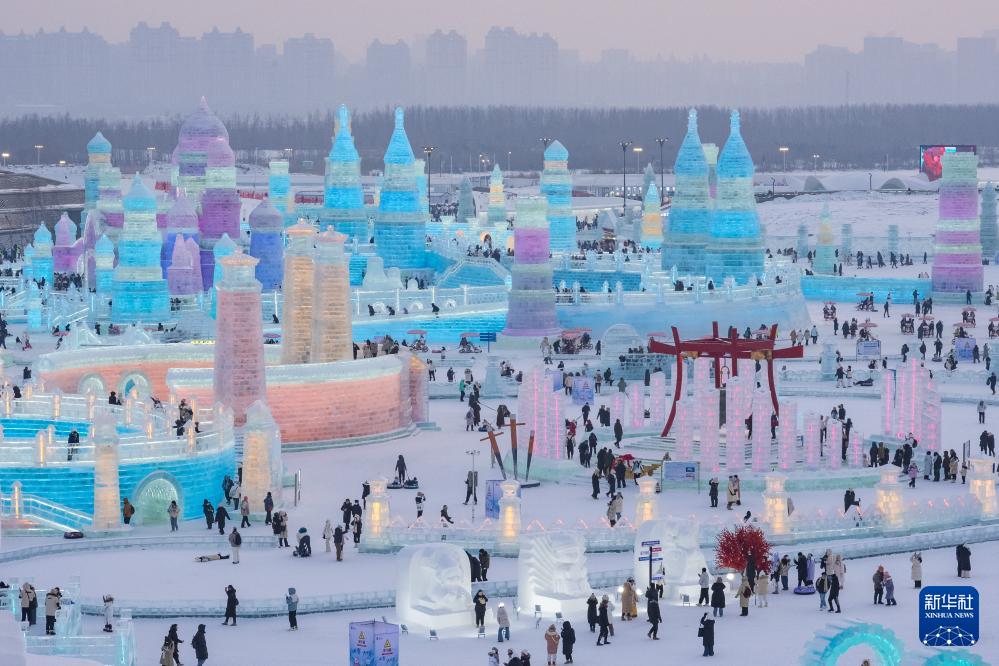 1月1日,遊客在哈爾濱冰雪大世界園區內遊玩(無人機照片)。