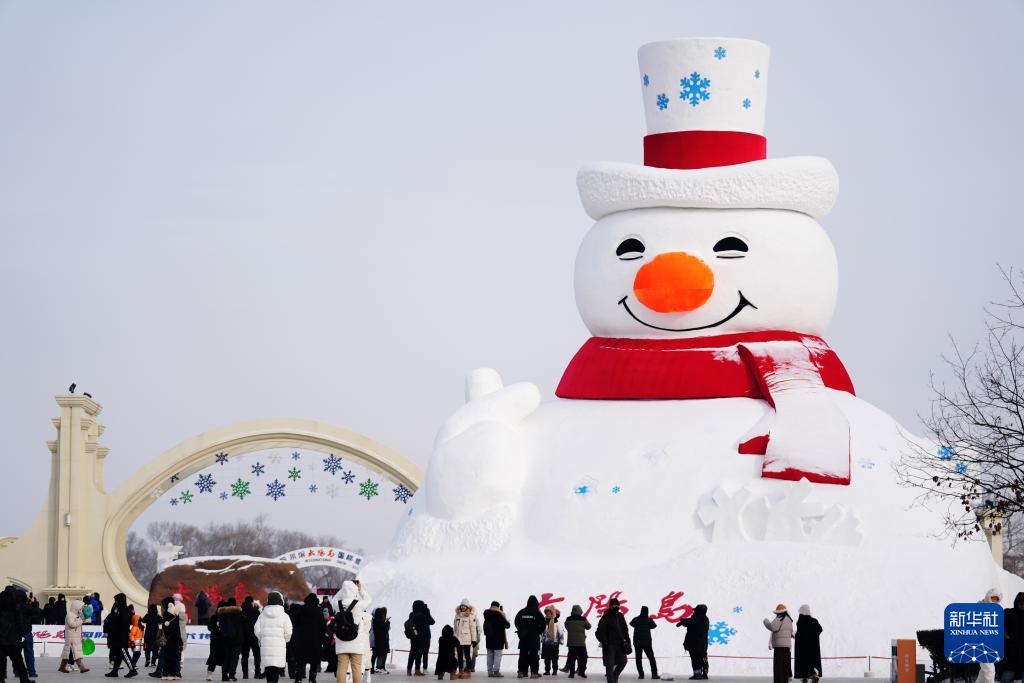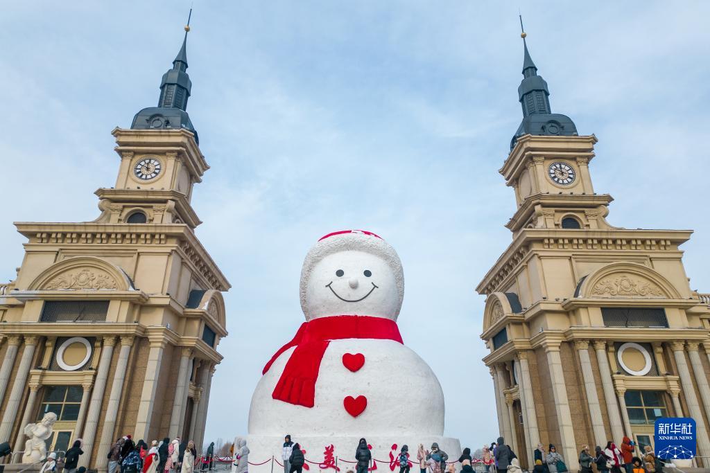 1月1日,在哈爾濱市群力音樂公園,許多遊客前來與雪人合影(無人機照片)。