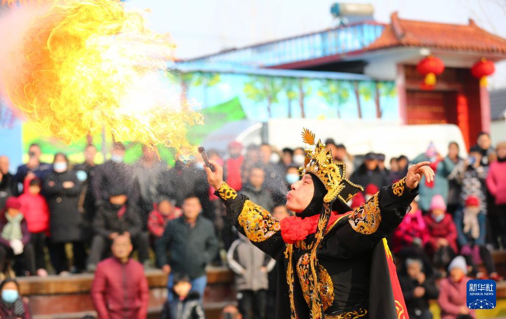 1月1日,在山東省滕州市西崗鎮,民間藝人在表演「噴火」絕活。