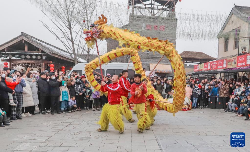 1月1日,遊客在河北省遵化市興旺寨鎮一景區觀賞舞龍表演。