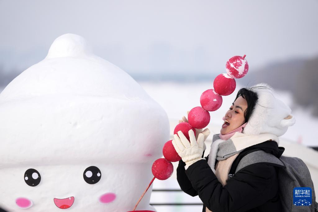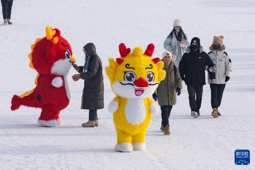 1月1日,在哈爾濱太陽島雪博會園區,工作人員與遊客互動。