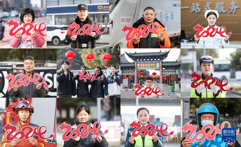 1月1日,江蘇省淮安市不同產業的人們展示「2024」字樣(拼版照片)。