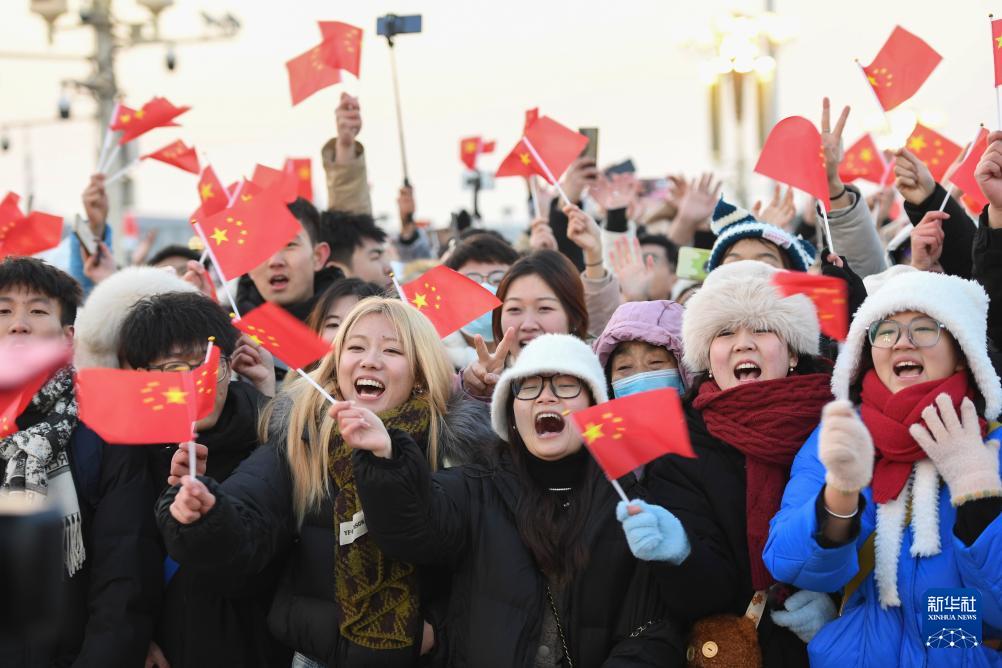 1月1日晨,北京天安門廣場舉行隆重的升國旗典禮。這是觀眾在升旗典禮結束後歡呼。