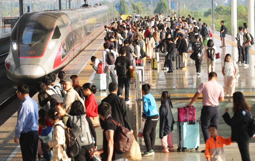 10月6日,旅客在湖南省衡陽東月月台排隊搭車。新華社發(曹正平攝)