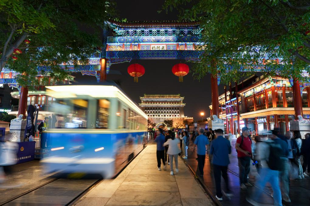 為迎接新中國成立75週年,北京點亮中軸線上的地標。遊客在前門大街和正陽門箭樓前參觀遊覽。新華社記者鞠煥宗攝