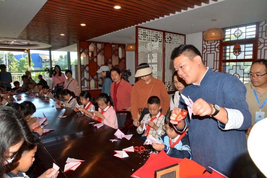 國慶日期間,邀請了南寧市戲劇院一級演員、粵劇自治區級非遺代表性項目代表性傳承人黃俊成,以及中國民間文藝家協會會員、中級工藝美術師——南寧剪紙市級非遺代表性項目代表性傳承人楊再旺等授課。 60位小學員圍坐一堂,歡聲笑語其樂融融,認真地傾聽老師講授。