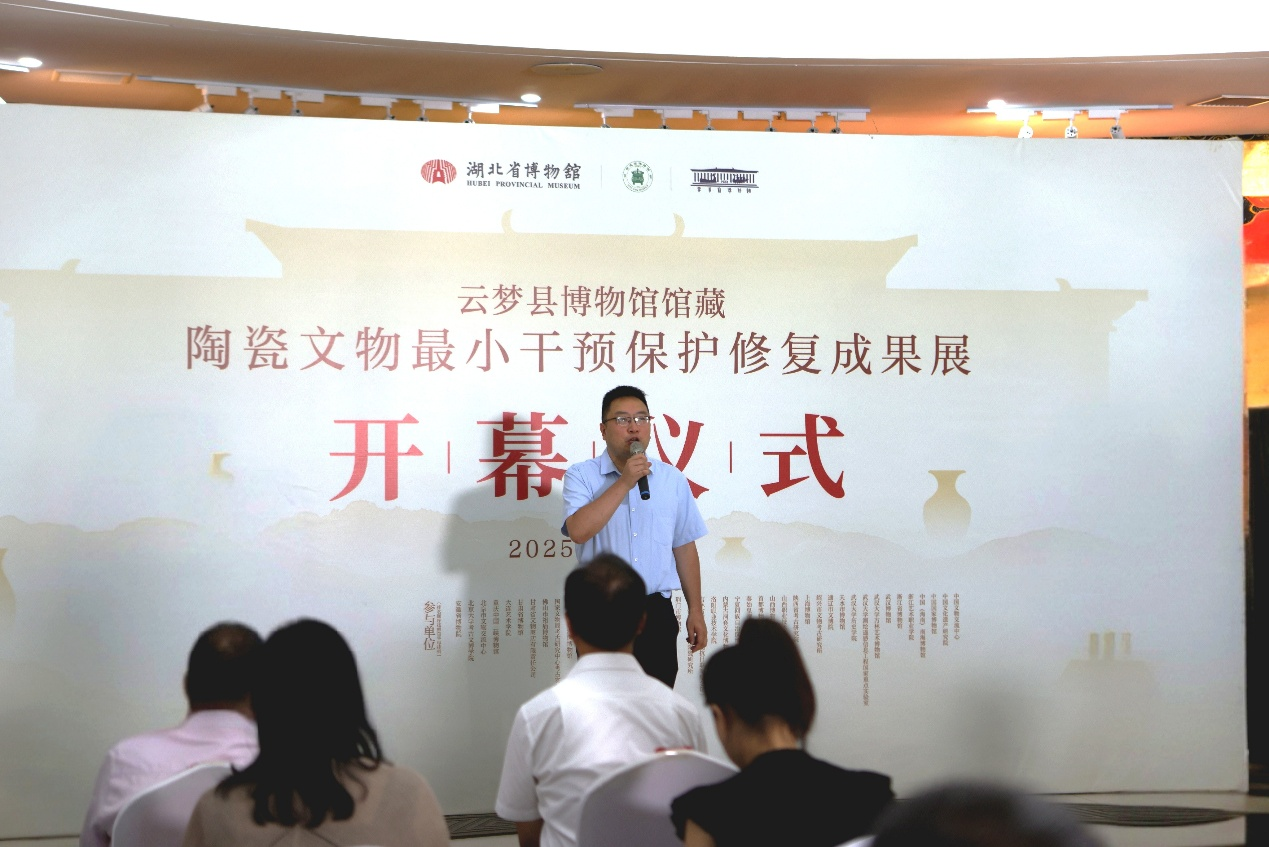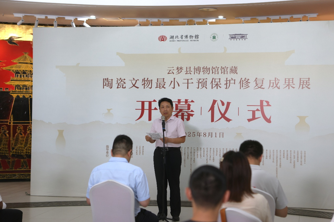 2025年8月1日上午,“陶瓷文物最小幹預保護修複”成果展在雲夢博物館開幕。此次活動由湖北省文化和旅遊廳(湖北省文物局)、中國文物保護技術協會指導,湖北省博物館、孝感市博物館、雲夢縣博物館聯合主辦,旨在集中展示陶瓷文物保護修複的最新實踐成果,推動行業技術交流與發展。開幕式由湖北省博物館黨委委員、副館長李奇主持,湖北省文化和旅遊廳博物館與社會文物處處長盧申濤,湖北省博物館黨委副書記王先福,武漢博物館館長任曉飛,武漢大學萬林藝術博物館副館長彭蛟,孝感市文旅局黨組成員、副局長吳健濤,雲夢縣委常委、宣傳部部長胡海波出席,來自全國12個省、區、市參與前期研修活動的學員代表,以及孝感市文化和旅遊局、雲夢縣文化和旅遊局、雲夢縣博物館等單位的領導和工作人員共50餘人參加開幕式。