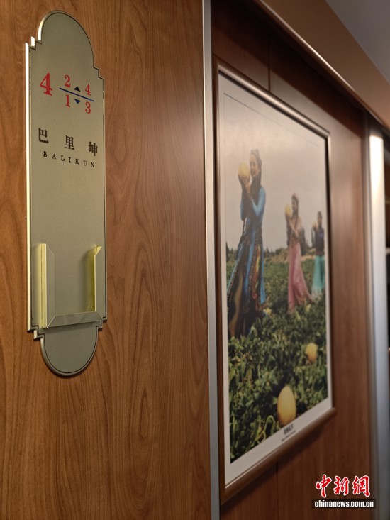 穿梭在車廂中間,處處可見新疆的濃濃風情。秉持著「一車一風景」的概念,車廂內每個房間均以新疆知名景區命名,房間門口還張貼著對應景點的美食美景海報,讓遊客未至景區,先浸風情。