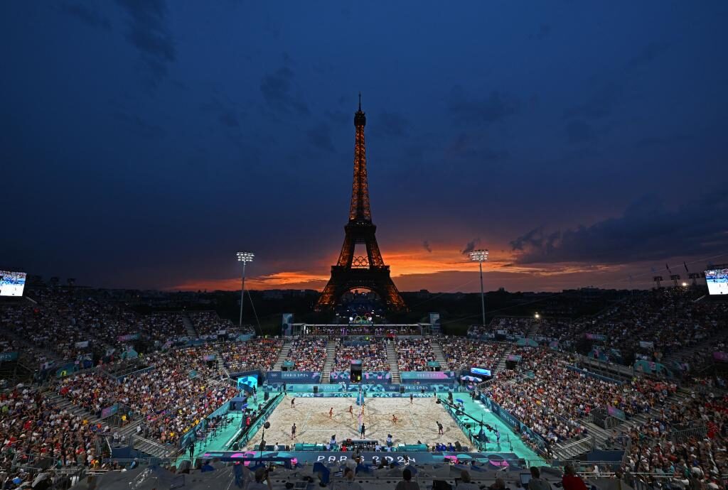 2024年7月31日,觀眾在艾菲爾鐵塔下觀賞巴黎奧運沙灘排球比賽。新華社記者李尕攝
