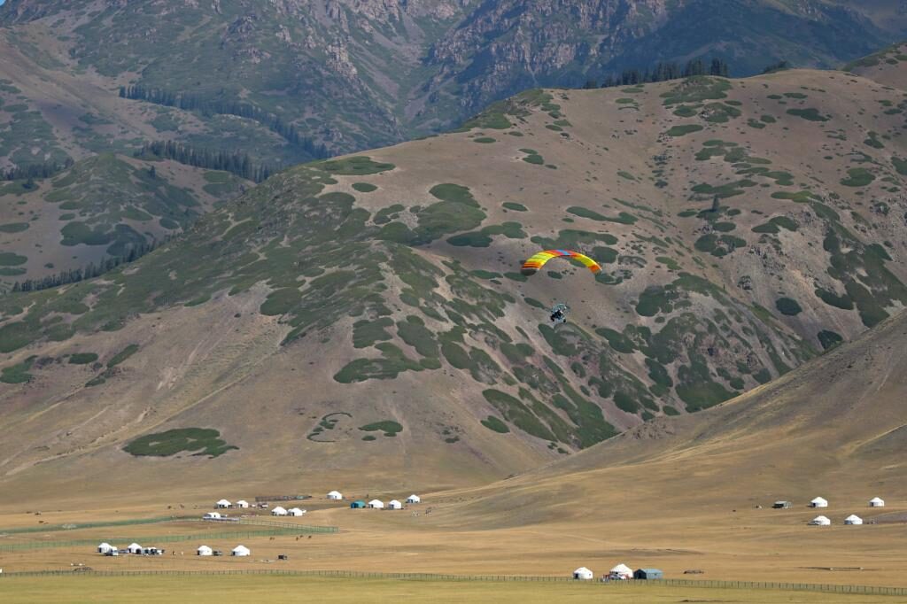 7月17日,遊客在賽里木湖景區體驗電動滑翔傘。新華社記者王婧嬙攝