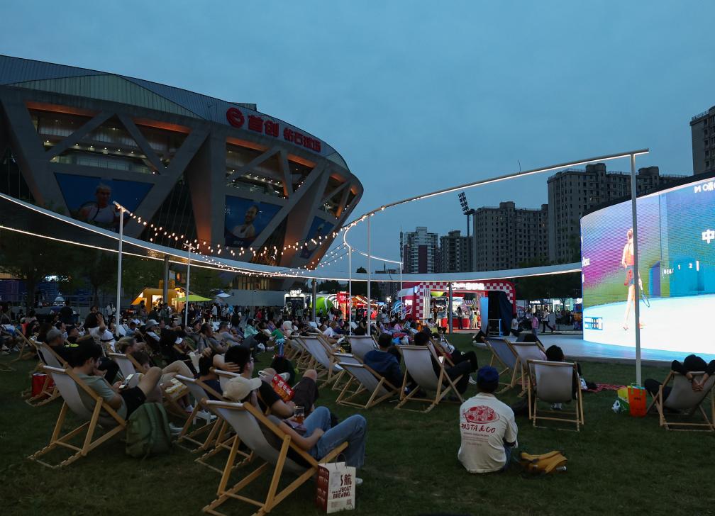 10月1日,遊客在國家網球中心內的大螢幕前觀看比賽。當日是國慶黃金週第一天,中國網球公開賽吸引不少球迷前來觀賽,人們在觀看高水準網球賽事的同時,也能體驗網球相關娛樂活動,在假期盡享體育魅力。新華社記者杜昕怡攝