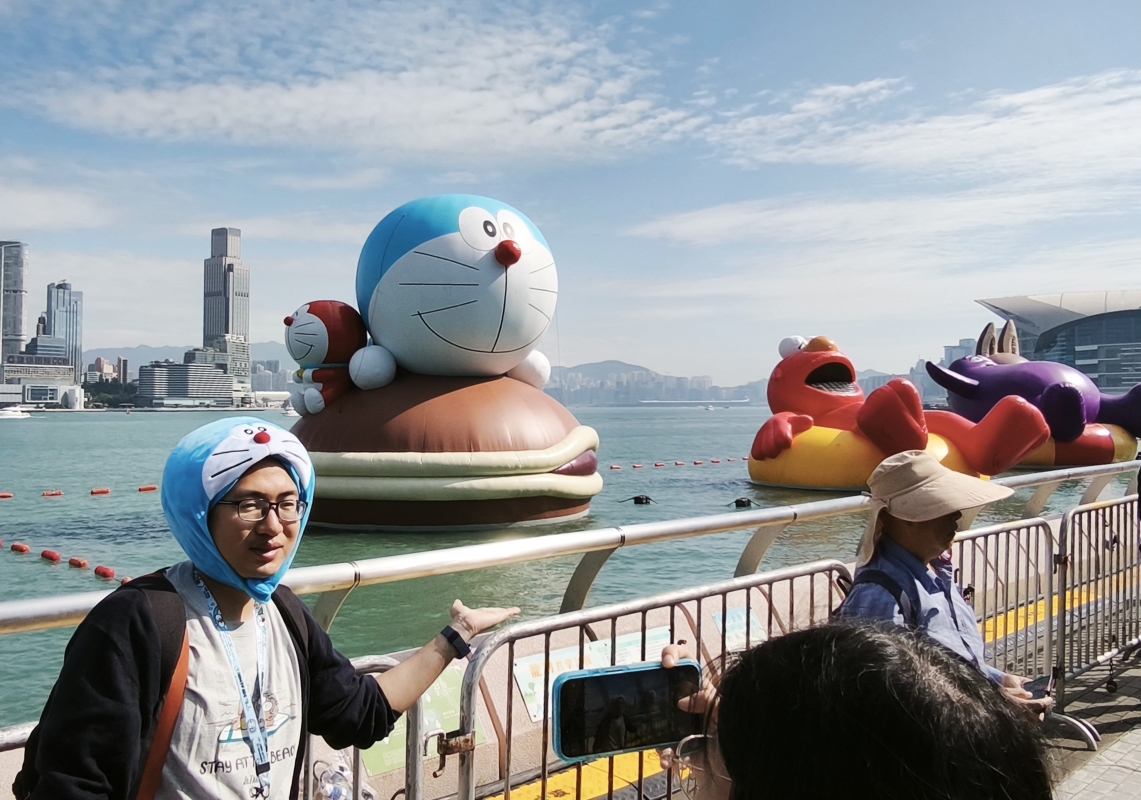 香港新聞網10月26日電(記者洪少葵)10月26日,巨型海上充氣雕塑公仔成為市民與遊客爭相“打卡”之處。不少市民帶同自己喜歡的玩偶拍照留影。“維港海上大巡游”活動25日起亮相香港金鐘添馬公園海濱,4個巨型充氣公仔包括多啦A夢、KAWS & 芝麻街(Elmo)、滑嘟嘟及LABUBU在維港展出,並於下月1日舉行“海上大巡遊”。