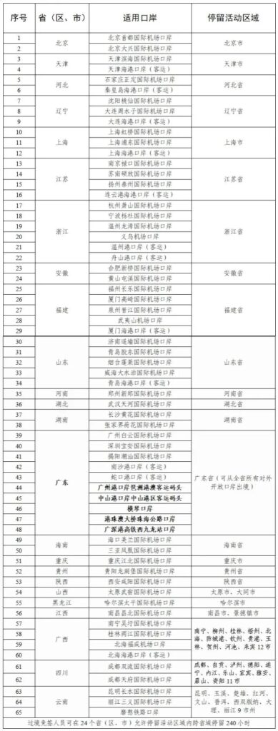 240小時過境免籤政策適用口岸和停留活動區域