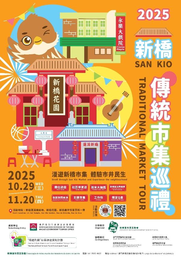 “2025新橋傳統市集巡禮於10月29日至11月20日期間在新橋蓮溪廟前地、新橋花園、義字街及青草街一帶舉行,活動包括攤位遊戲、社區導賞遊、周末大抽獎、新橋區消費優惠、街區快閃表演、5個主題特色市集、工作坊及限定Q畫等。其中,手作坊將帶來製作非遺扎染、非遺鏍鈿胸針及頭飾的體驗,讓旅客和居民浸沉式體驗澳門充滿懷舊風情的傳統社區,展現澳門多元文化。