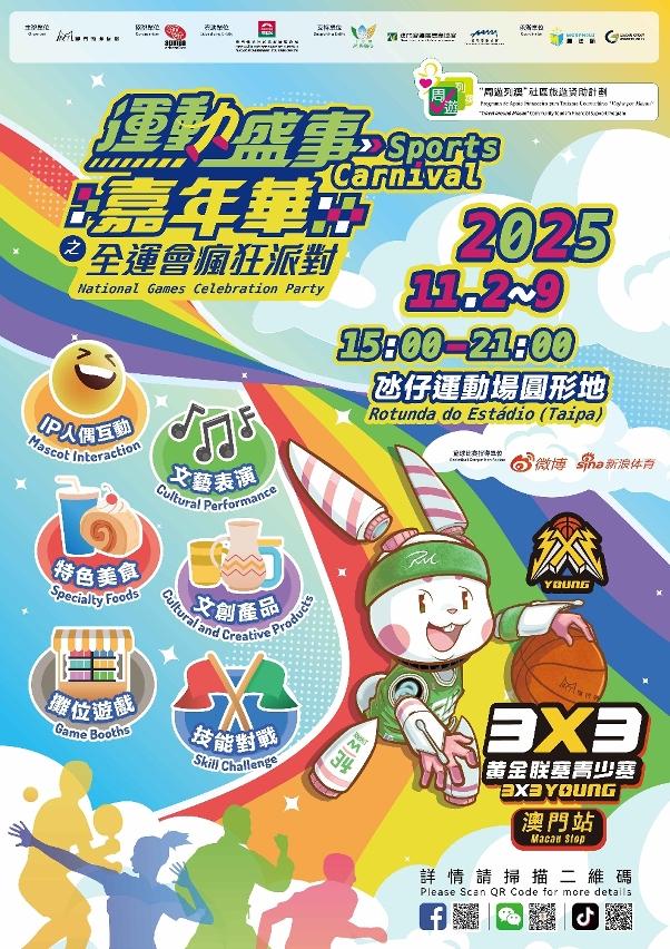 “運動盛事嘉年華之全運會瘋狂派對”於11月2日至9日在氹仔運動場圓形地舉行,派對集3×3黃金聯賽青少年賽澳門站、文創攤位、美食攤位、文藝表演、攤位遊戲、特色打卡點、IP人偶互動、技能對戰等活動於一身。藉著十五運的契機,以豐富澳門“旅遊+”體育的多元內涵為旅客及居民打造一個休閒好去處。