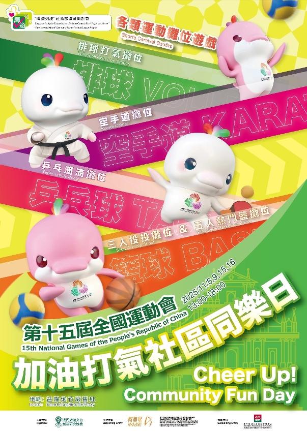 第十五屆全國運動會《加油打氣社區同樂日》 於11月8日至16日期間逢星期六日在氹仔益隆炮竹廠帶來以運動為主題的玩樂攤位:乒乓滴滴攤、三人投投 & 五人熱鬥籃、排球打氣攤、FATFAT 充氣功夫空手道及戶外大型充氣 & 運動互動區,更特別安排運動專業講座與加油音樂演出,讓大家在歡樂氛圍中感受體育魅力。