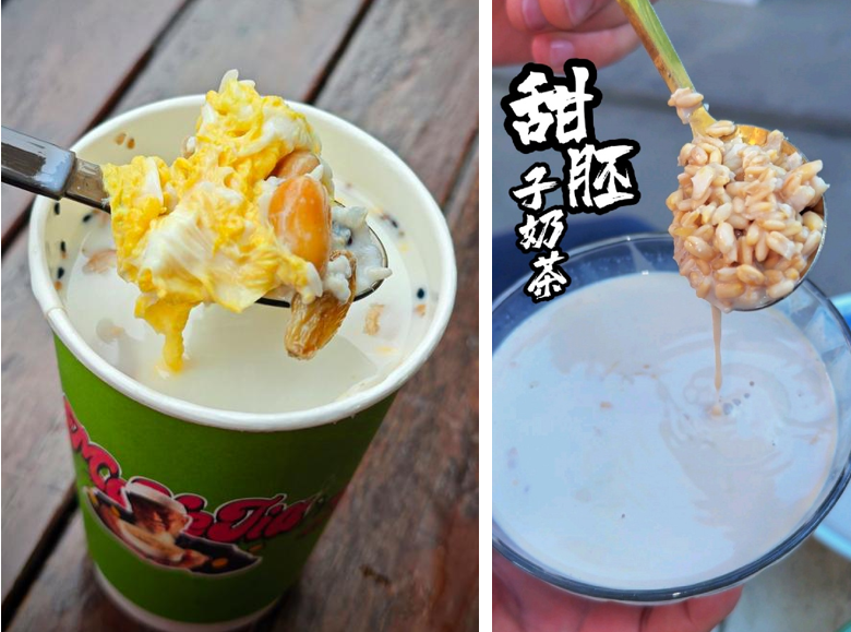 特色甜品飲品分別是牛奶雞蛋醪糟、甜胚子奶茶。雞蛋醪糟奶香濃鬱,甜胚子奶茶是帶有發酵穀物香的地方特色飲品。