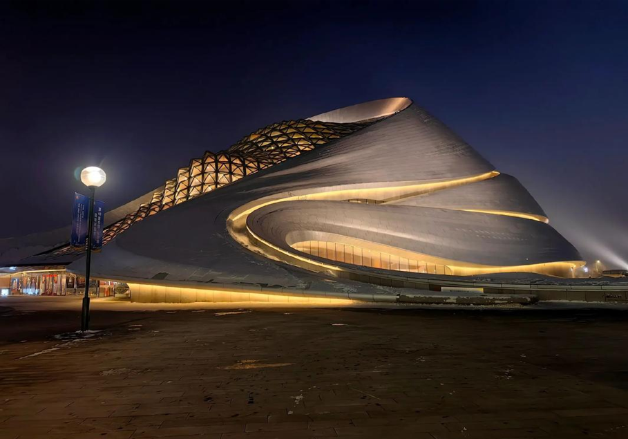 這座建築本身就是藝術品,曲線外觀如凝固的音符,日夜交替間折射出冰城獨有的光影詩意。