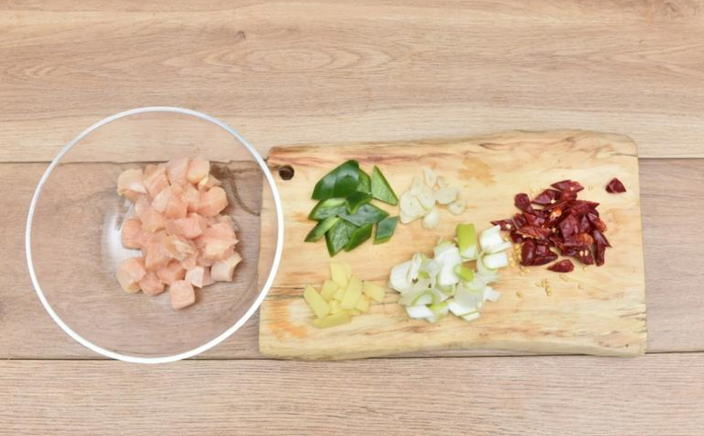 主料是雞胸肉或雞腿肉切丁,配以油炸花生米、蔥段、幹辣椒、花椒。