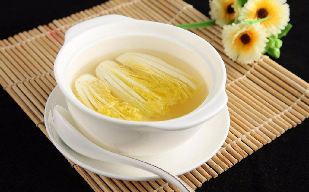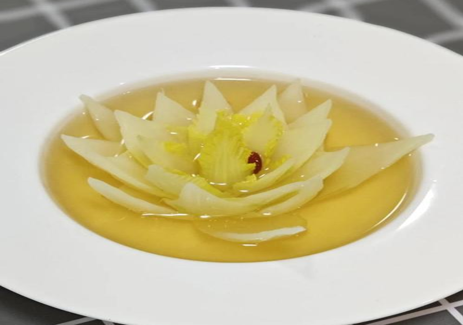 成菜的外觀是一碗清湯中靜臥著一顆如玉般的白菜心,湯色清澈透明,毫無雜質,形如開水泡白菜,樸素至極。