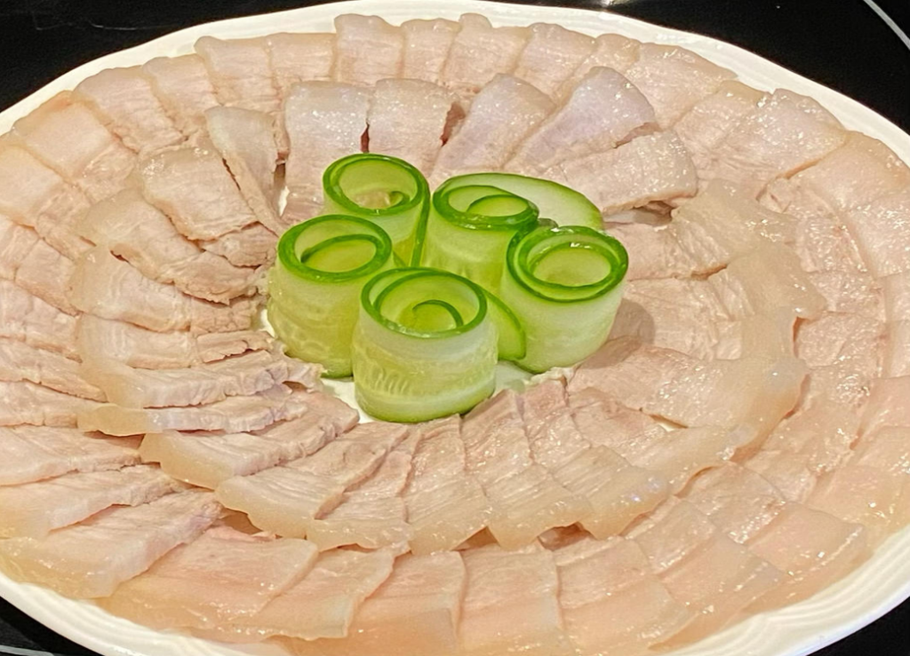 「白肉」傳統必選肥瘦相間、皮薄肉嫩的豬後腿 ,此部位肥瘦比例勻稱,煮熟後不易過柴或過膩。