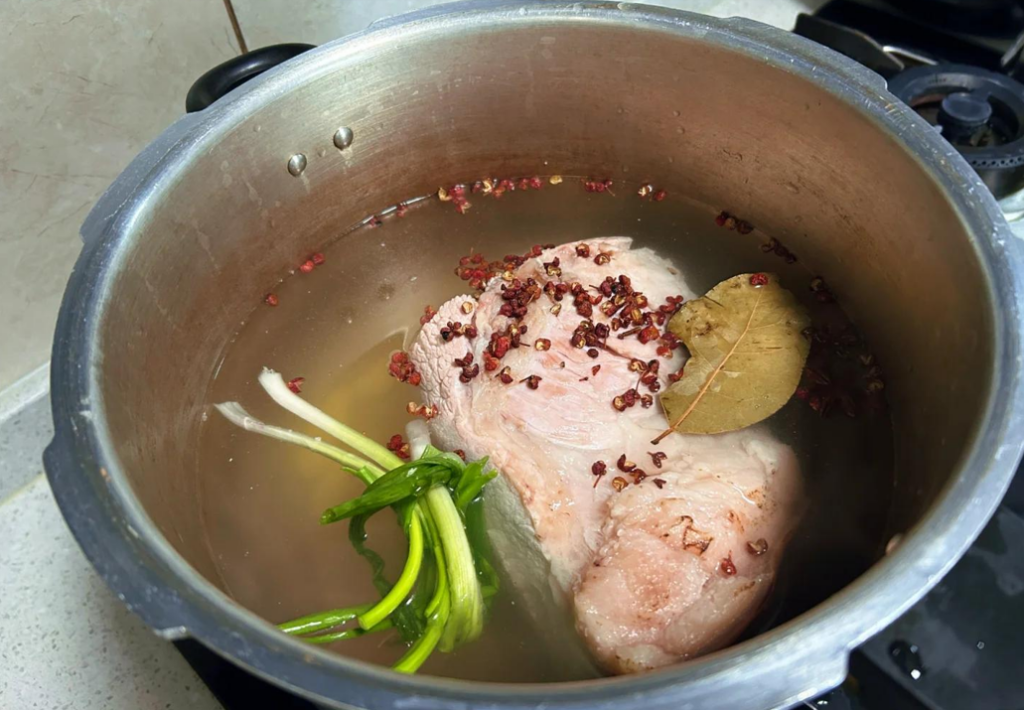 整塊肉以清水,加入薑、蔥、花椒等香料煮熟,關鍵在於火候控制,須使肉質剛斷生為佳,內部保有肉汁與嫩度。