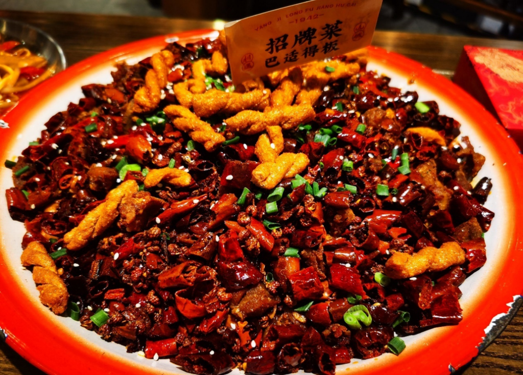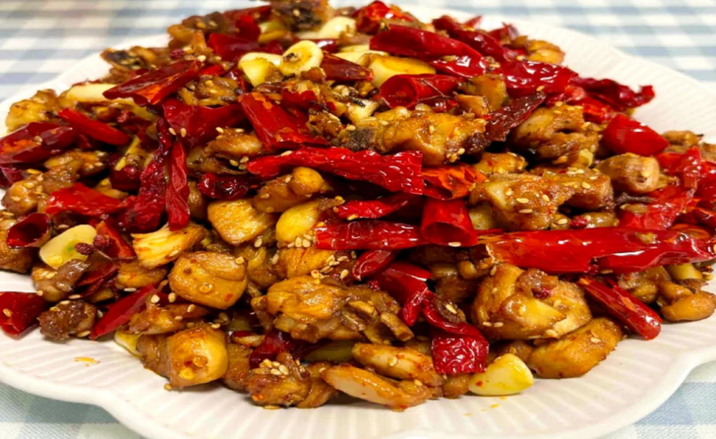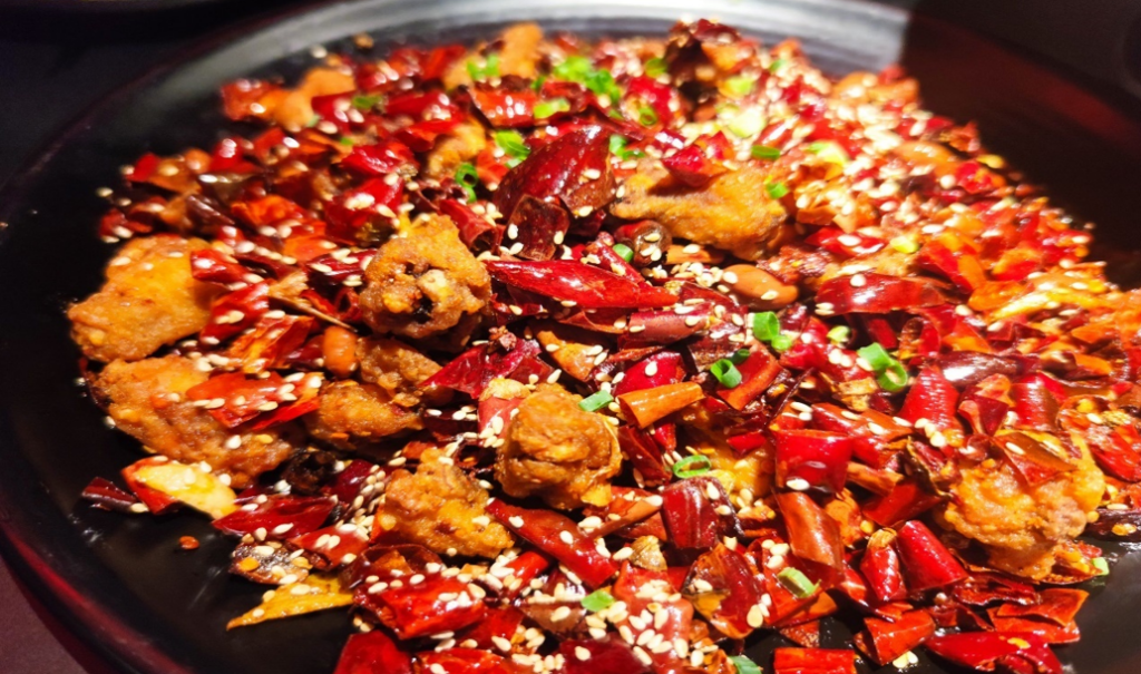 大量乾辣椒與花椒鋪滿盤中,雞塊深藏其內,呈現一片豪邁的紅火景象。