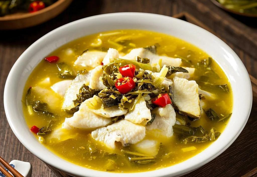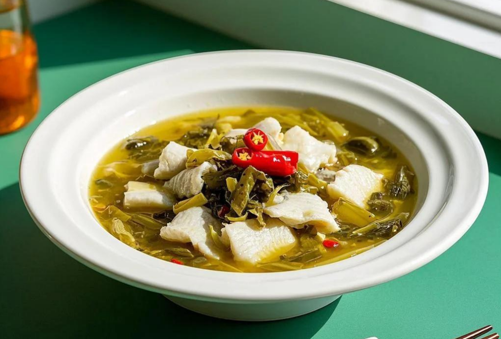 重慶酸菜魚的酸味核心,來自當地特有的「老壇泡酸菜」,酸菜經過長時間的乳酸發酵,酸味醇厚自然、帶有獨特的發酵香氣,是湯底風味的骨架。