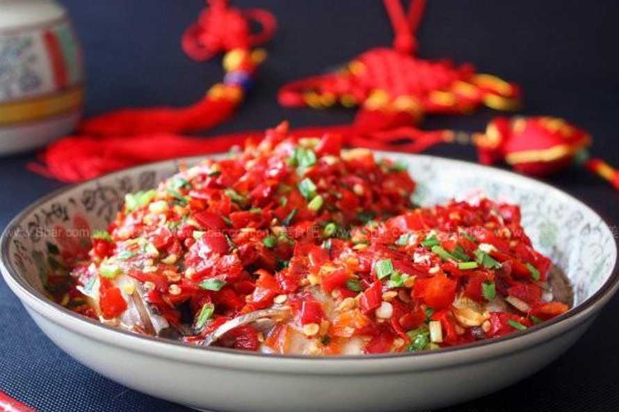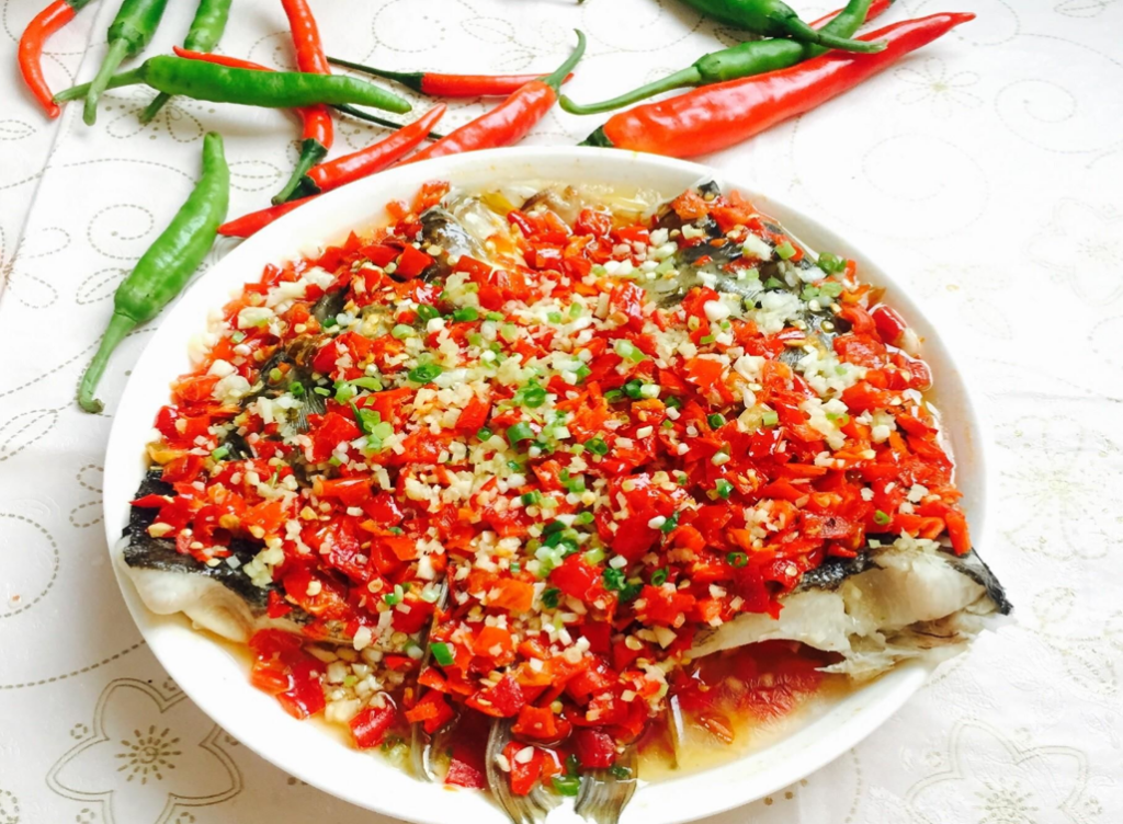 紅剁椒鹹鮮香辣,發酵味濃;黃剁椒(泡椒)則酸香突出。兩者混合,鋪滿魚頭,構成了層次豐富的味覺基礎。