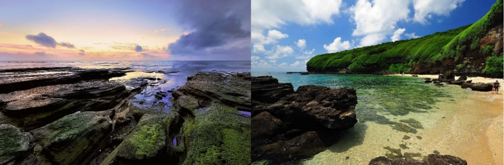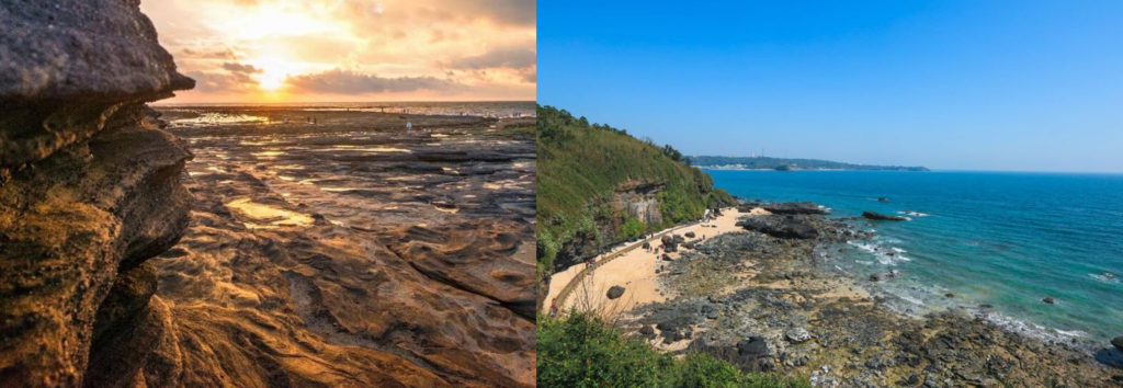 滴水丹屏以朱紅崖壁與海蝕洞為特色,午後陽光灑在岩壁上,水滴折射出七彩光暈,日落時分更是晚霞漫天,美到窒息。