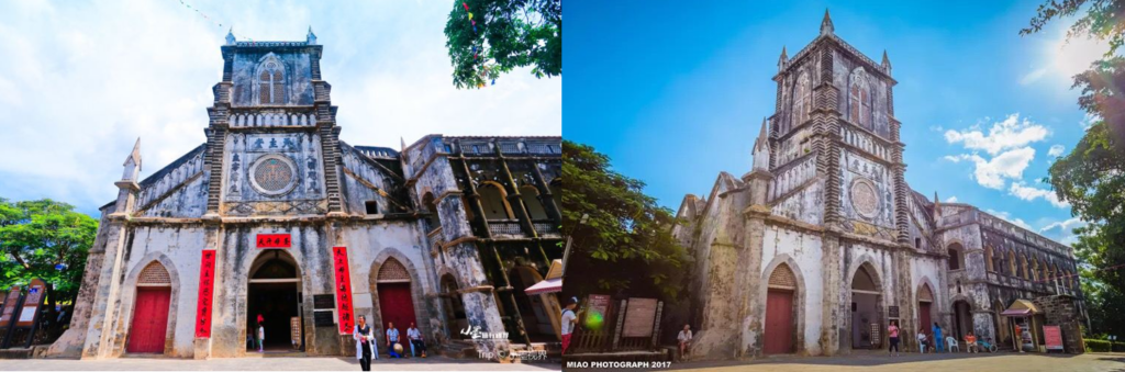 百年天主教堂藏在村落間,由老珊瑚石砌築而成,哥特式尖頂搭配斑駁石牆,兼具異域風情與歲月質感,適合拍復古風照片。