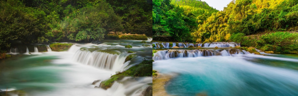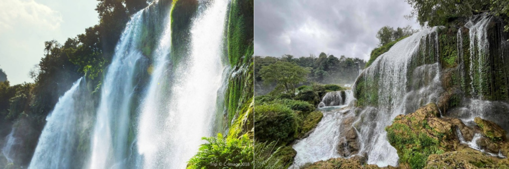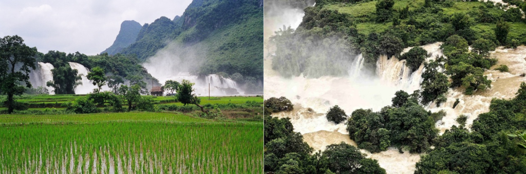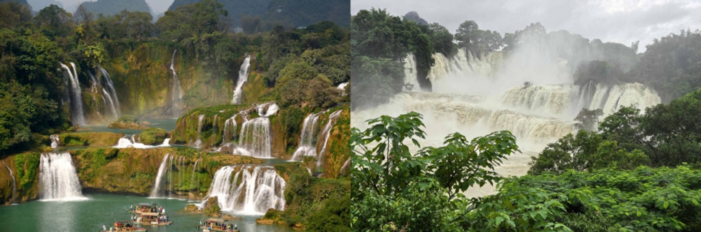 晴日裡,陽光穿透水霧形成絢麗彩虹,橫跨中越兩國;雨天時,瀑布裹著雲霧,如仙境般縹緲。
