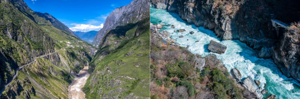 核心打卡點首推上虎跳的「虎跳石」,江心巨石屹立,金沙江奔騰至此劈波斬浪,水花飛濺數米,是拍攝峽谷壯闊全景的最佳機位。