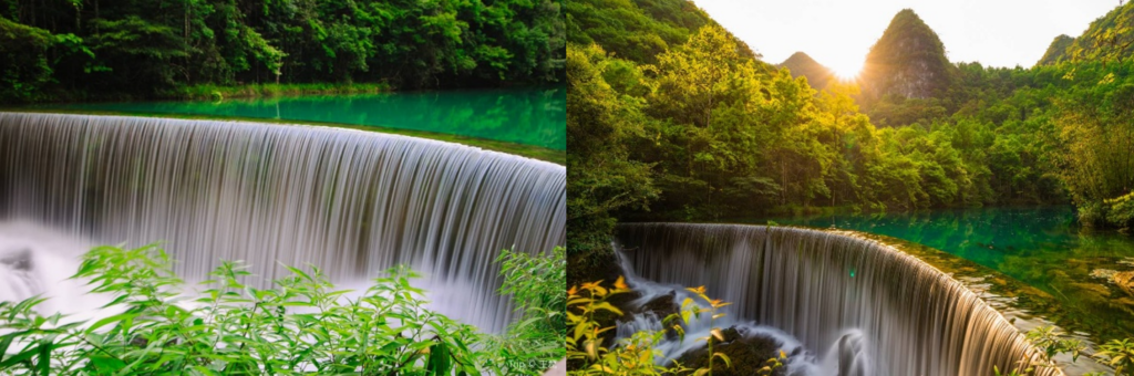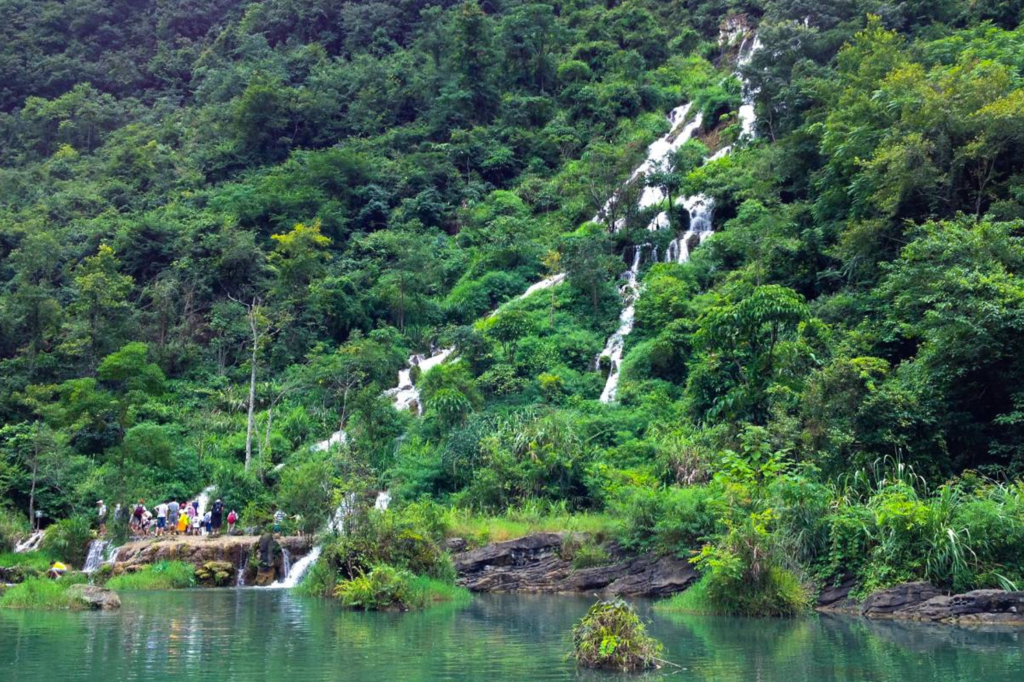 岸邊的喀斯特峰叢錯落有致,綠樹翠竹環繞,與銀白色的瀑流構成絕美畫卷。
