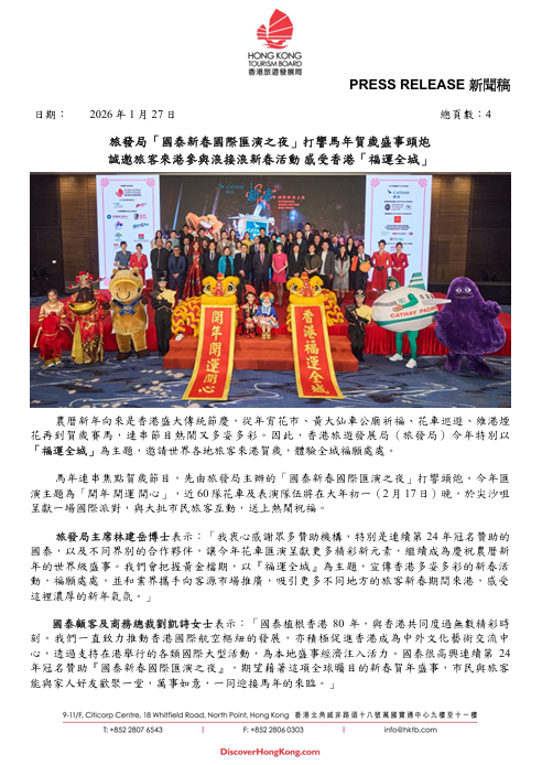 30 一月 香港旅發局「國泰新春國際匯演之夜」打響馬年賀歲盛事頭炮 誠邀旅客來港參與浪接浪新春活動 感受香港「福運全城」 Posted at 11:23h in 旅遊界消息發佈, 最新消息 by atec 0 Likes Share 香港旅發局「國泰新春國際匯演之夜」打響馬年賀歲盛事頭炮 誠邀旅客來港參與浪接浪新春活動 感受香港「福運全城」 日期: 2026年1月27日 來源:香港旅遊發展局 01-2026ICNYP-Announcement-Release-C.pdf