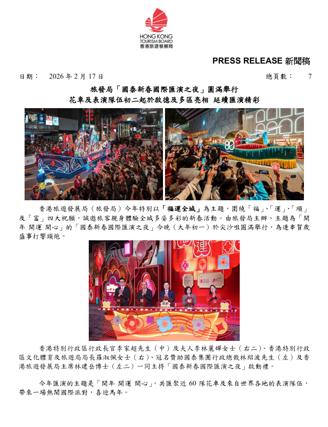 23 二月 旅發局「國泰新春國際匯演之夜」圓滿舉行 花車及表演隊伍初二起於啟德及多區亮相 延續匯演精彩 Posted at 10:33h in 旅遊界消息發佈, 最新消息 by atec 0 Likes Share 旅發局「國泰新春國際匯演之夜」圓滿舉行 花車及表演隊伍初二起於啟德及多區亮相 延續匯演精彩 日期: 2026年2月17日 來源:香港旅遊發展局 點擊以上圖片查看詳情
