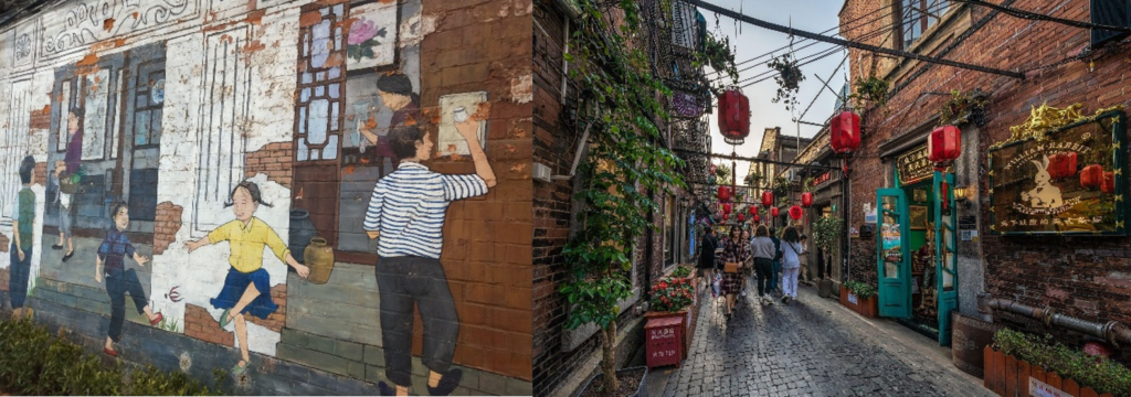 這裡的石庫門建築藏有無限驚喜:彩色玻璃門窗映著陽光,光影斑駁宛如電影場景;燈籠巷內紅燈籠綴滿窄巷,夜景氛圍感十足。
