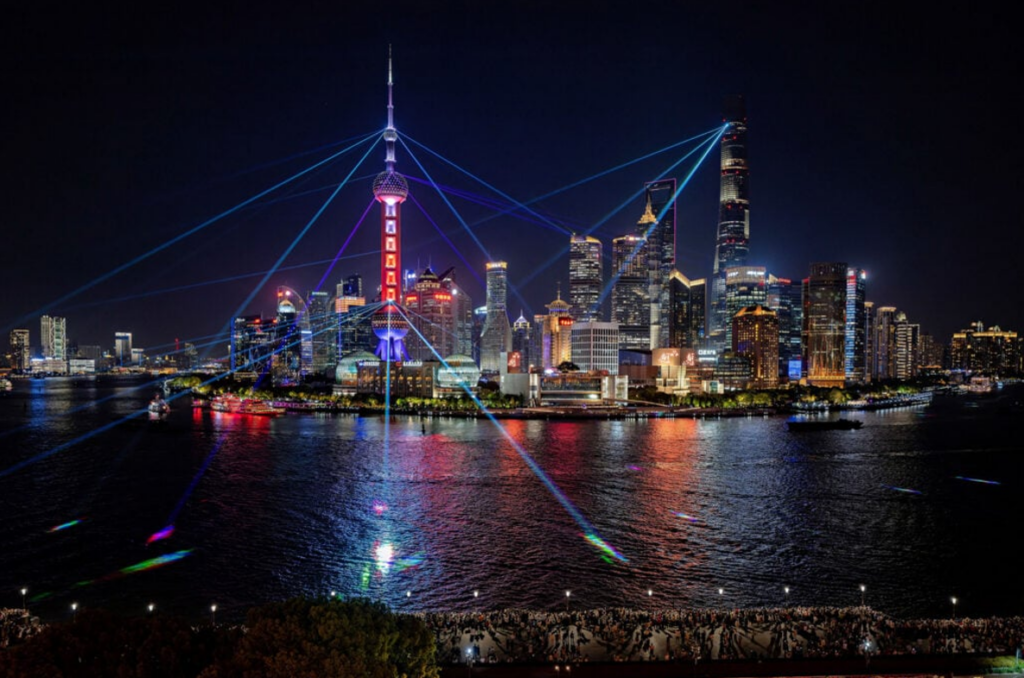 當夜幕降臨,塔身燈光隨音樂變幻,與外灘燈火交相輝映,勾勒出夢幻般的浦江夜景。