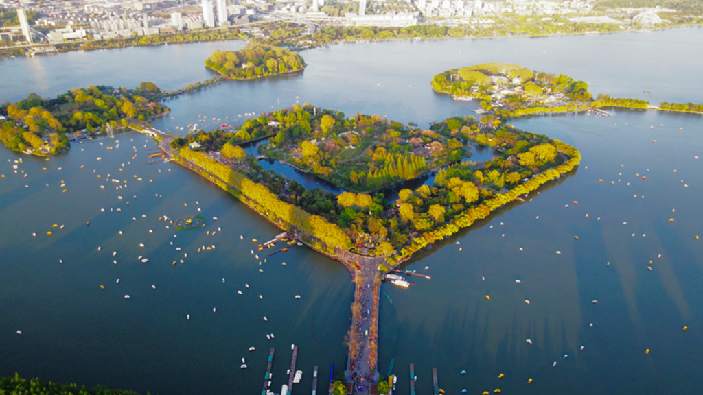 玄武湖由環洲、櫻洲、梁洲、菱洲、翠洲五洲組成,水路相連,風光各異。