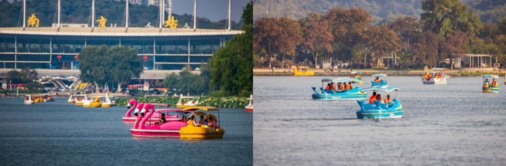 遊客可選擇多種遊玩方式。例如乘遊船蕩漾湖面,從水上觀賞明城牆、紫峰大廈的古今交融。