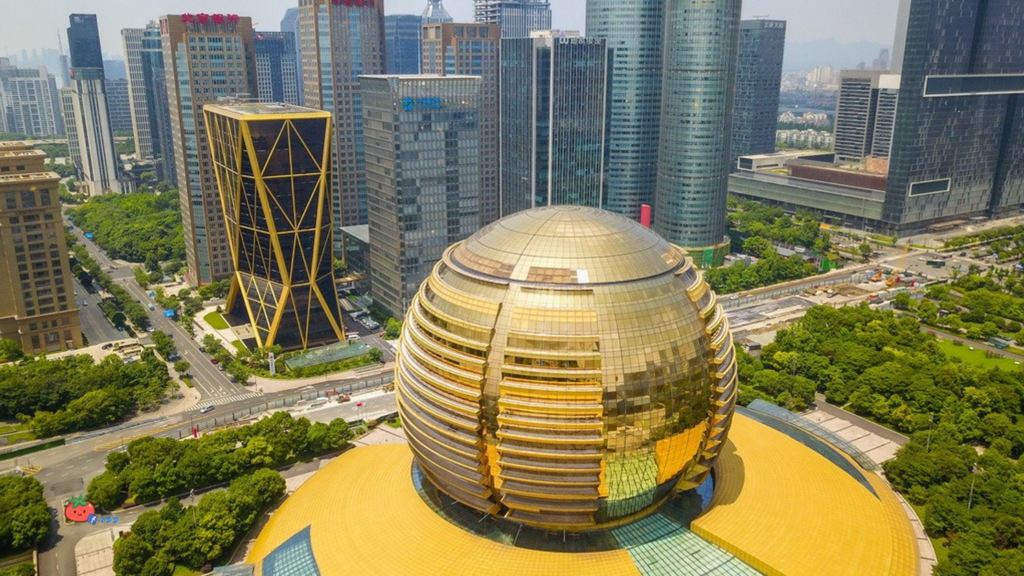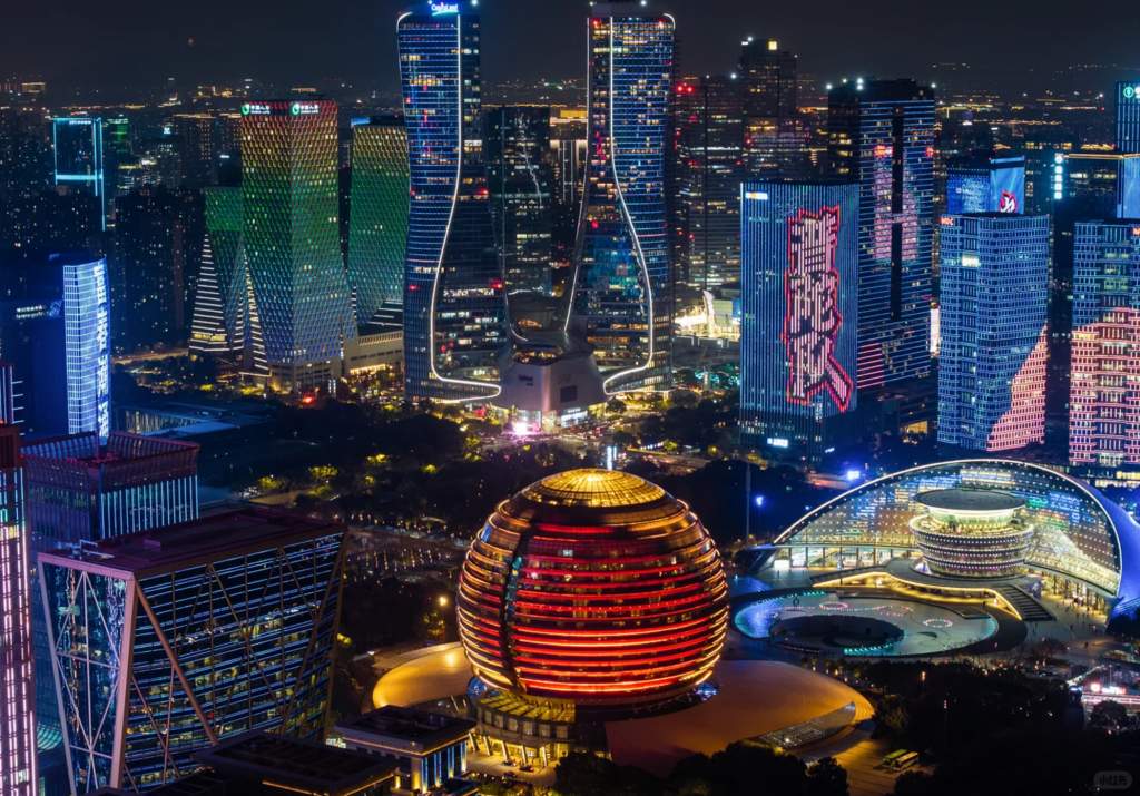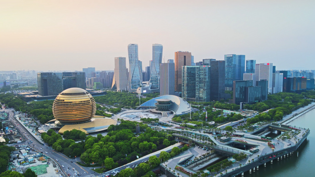 地標建築極具辨識度。杭州大劇院(月牙形)與國際會議中心(金色「大金球」)組成「日月同輝」的經典畫面。