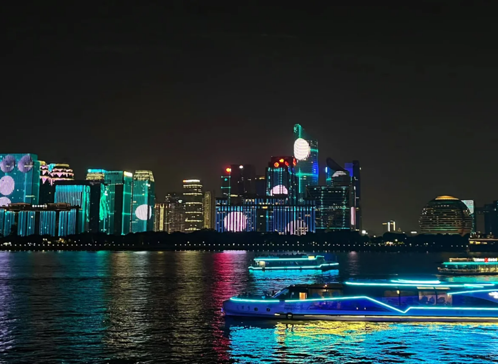 乘遊船夜遊錢塘江,從水上視角看兩岸燈火璀璨。