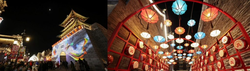 每週五、六晚,3D建築燈光秀如期上演,晉商駝隊、雙塔淩霄等光影在樓體流轉,燈火璀璨間盡顯古今交融之美。