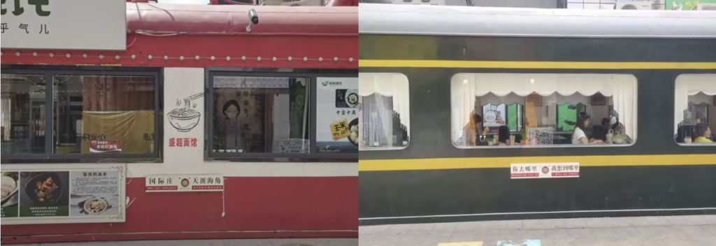 此外,17節退役綠皮車廂被打造為特色美食街區,遊客可坐在復古座椅上,品嘗驢肉火燒、臭豆腐、烤串等各類特色小吃。