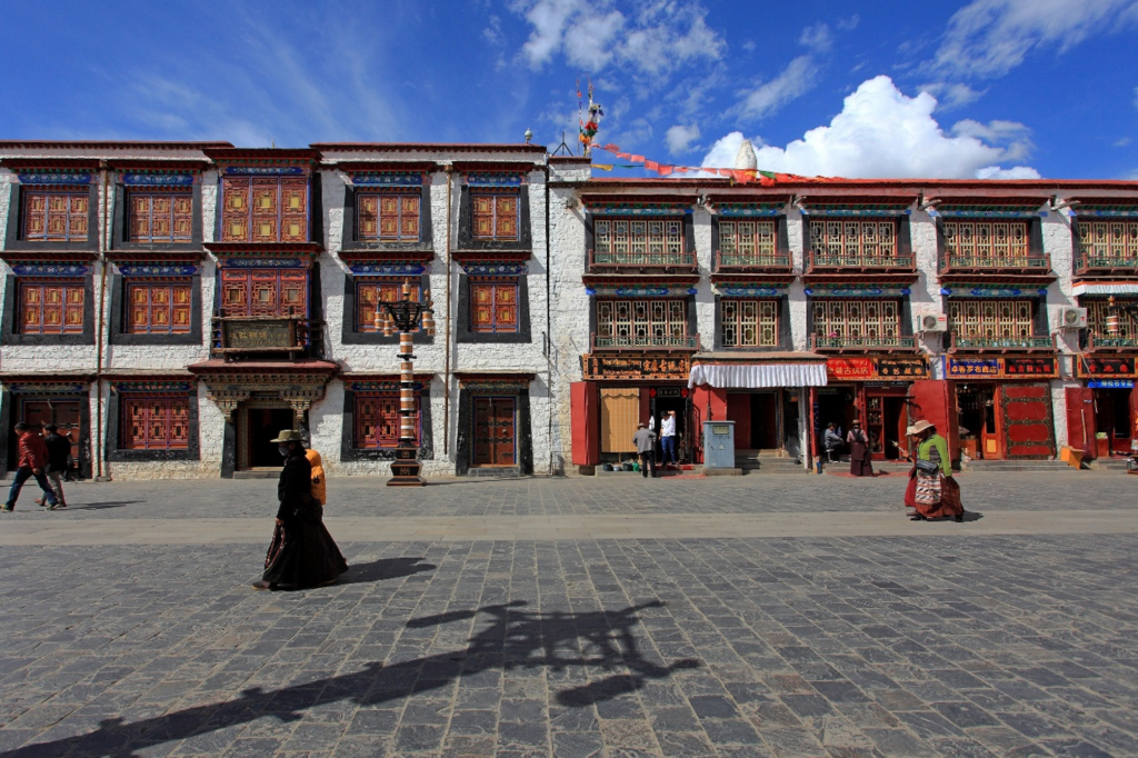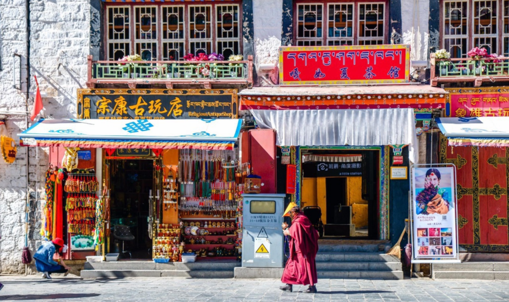 街區裡藏著豐富的文化體驗,遊客可租賃華麗的藏服,在古牆、經幡與大昭寺前拍攝寫真。