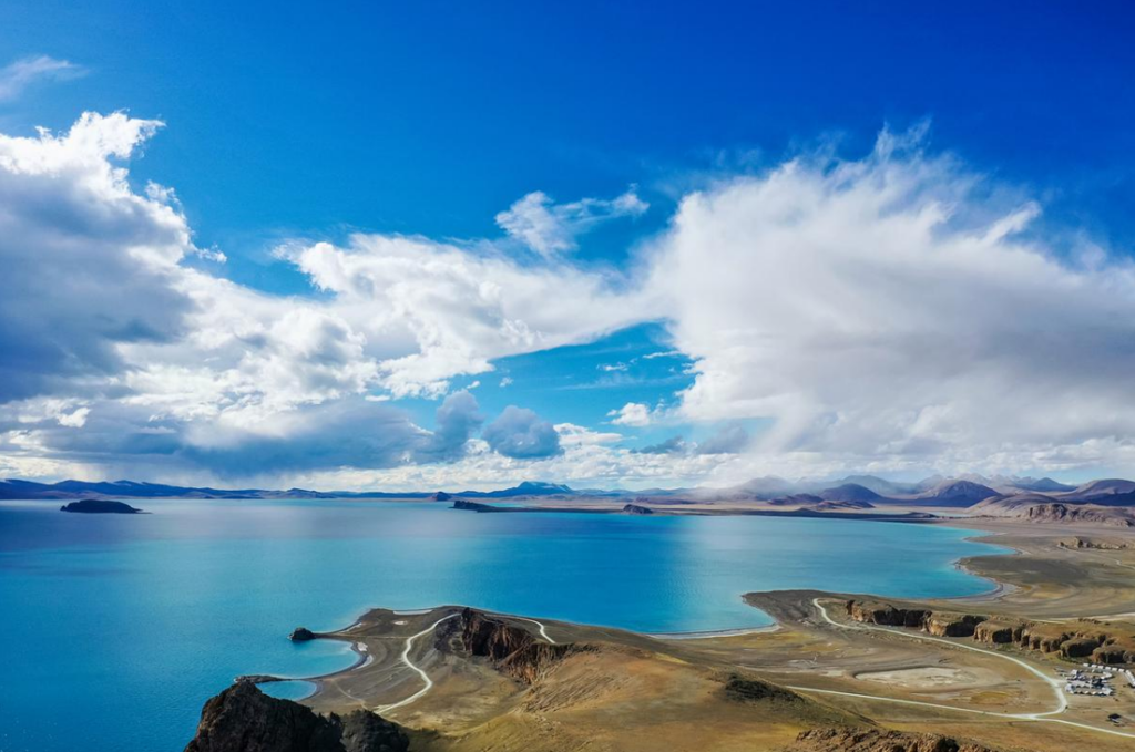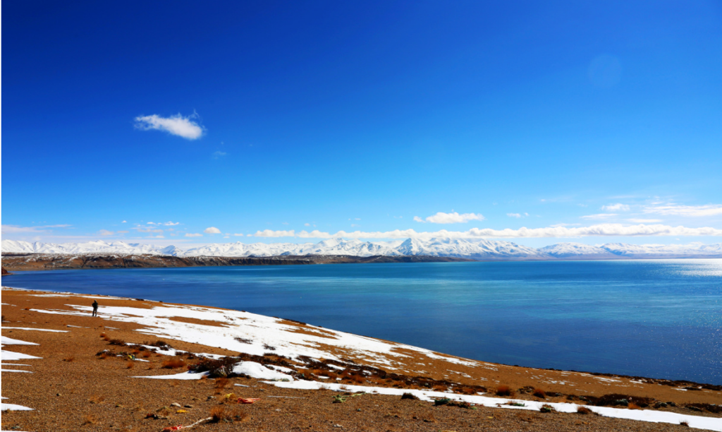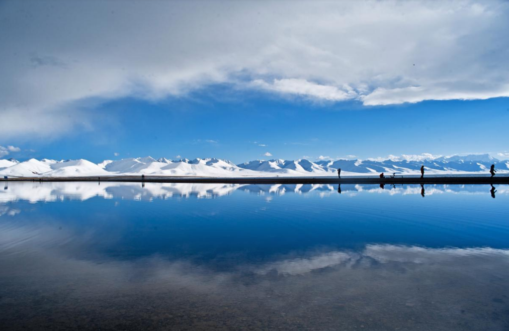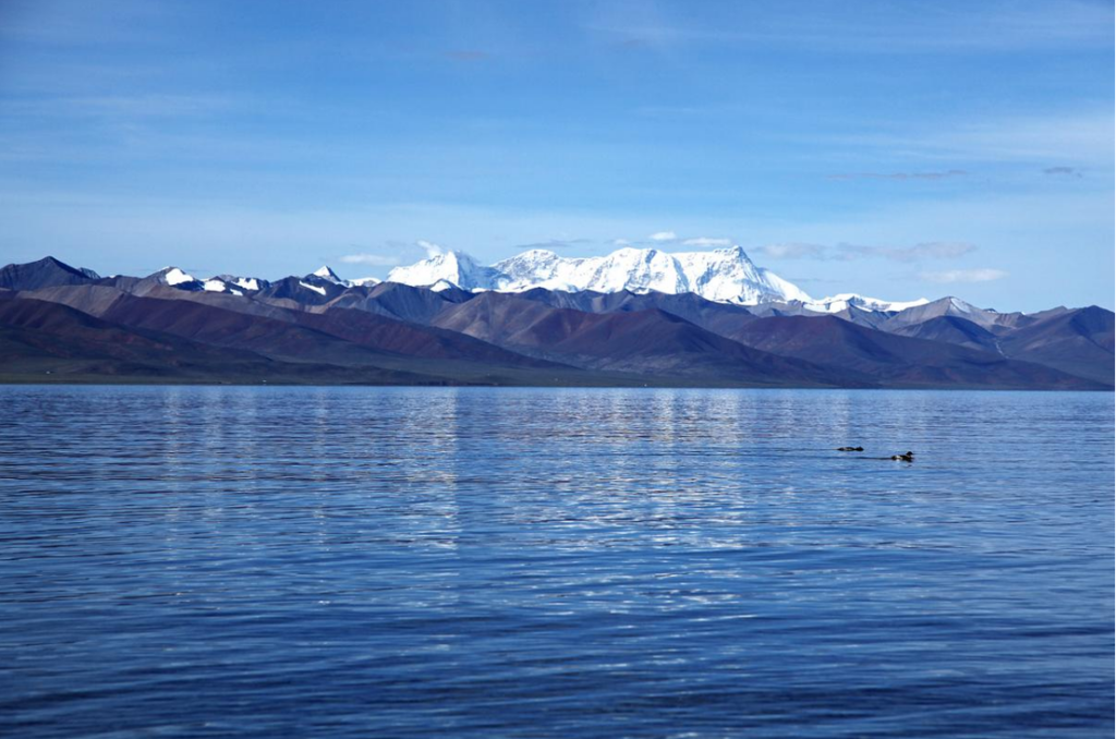 天氣晴好時,蔚藍湖面倒映著白雲雪峰,遠處雪山隱約可見,景色奇美。