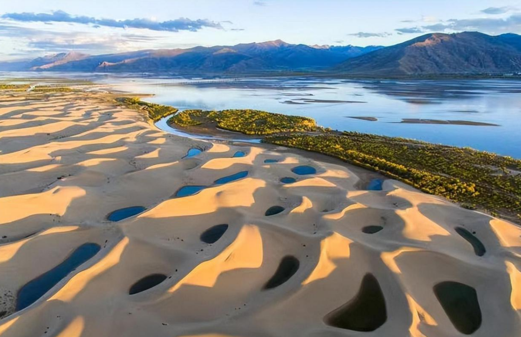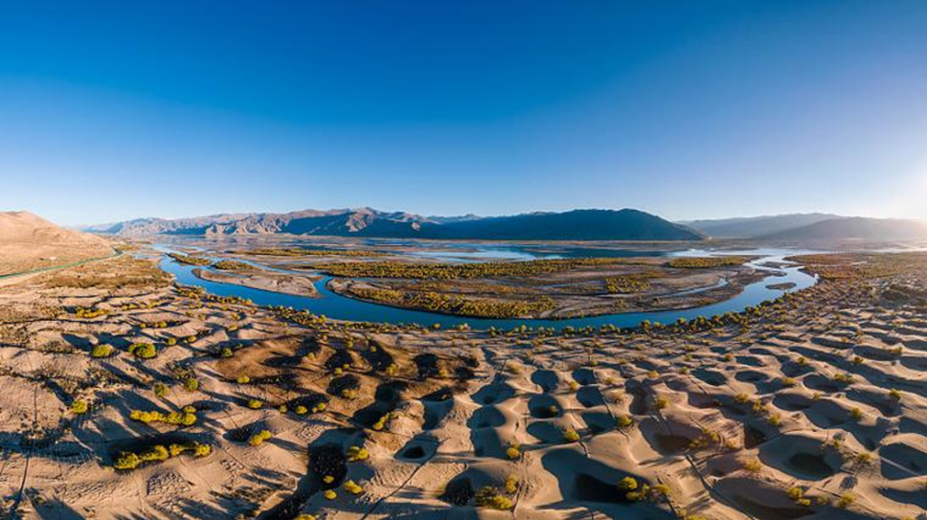 這裡擁有獨特的自然景觀——金色沙丘與江畔綠洲並存,形成「一半沙漠一半綠洲」的壯美畫卷。