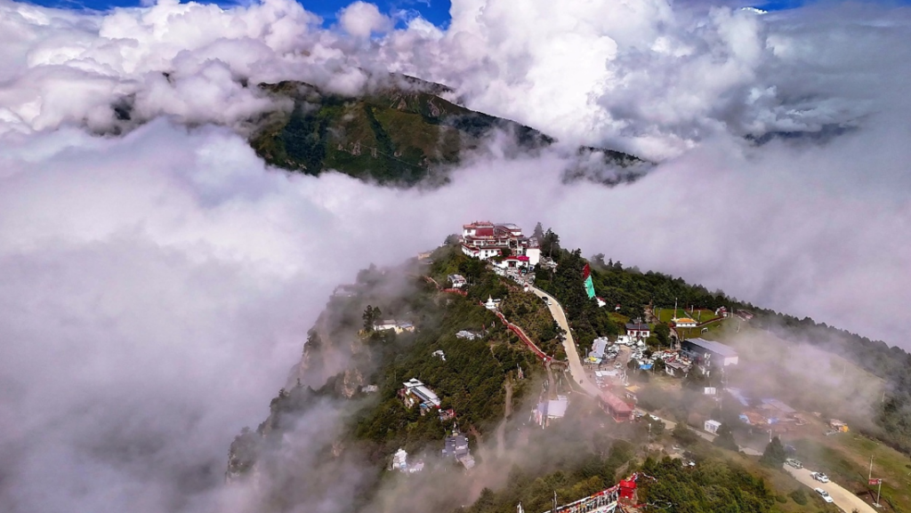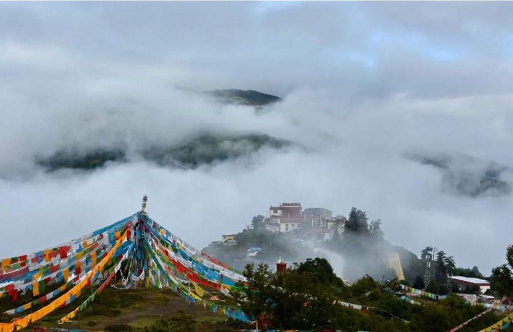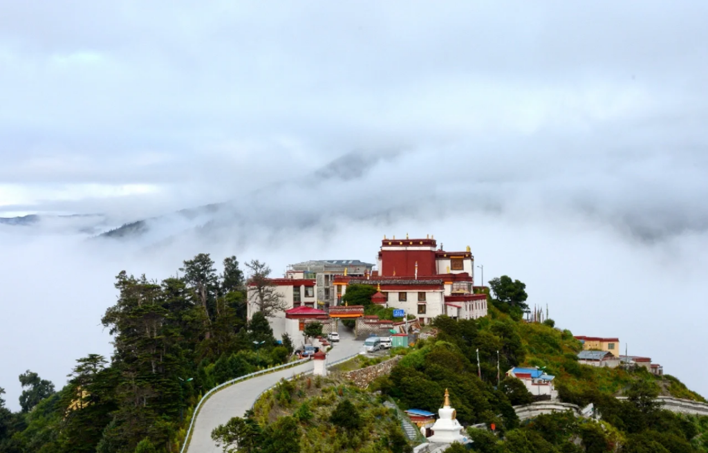 寺廟依山臨崖而建,紅牆金頂在雲霧中若隱若現,宛如「天空之城」。清晨雲開霧散,陽光灑落金頂,景色震撼人心。