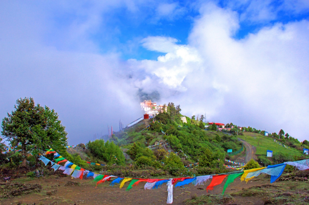景區核心卡久寺全稱「吉祥隱修院」,距今已有千年歷史,是蓮花生大師閉關7年之久的修行聖地,也是寧瑪派重要隱修祖寺。